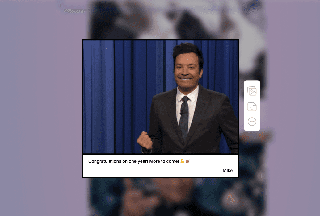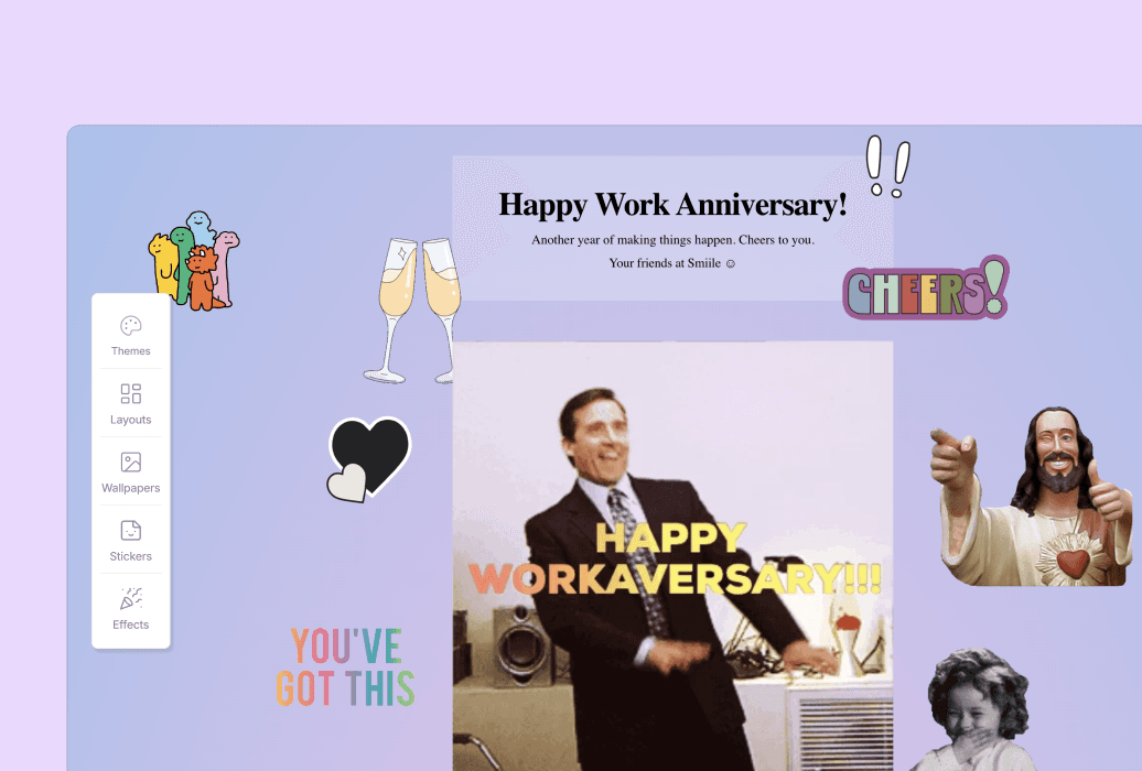A work anniversary deserves more than a Slack emoji. Smiile cards are modern, thoughtfully designed, and come with Giphy sticker packs built in. Every message feels personal, not like a wall of sticky notes.