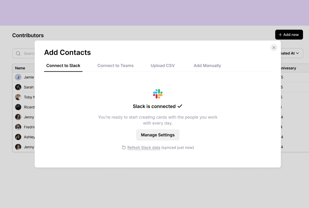 Celebrate a work anniversary properly — a beautifully designed card signed by the team, delivered on the day. Works with Slack and Teams.
