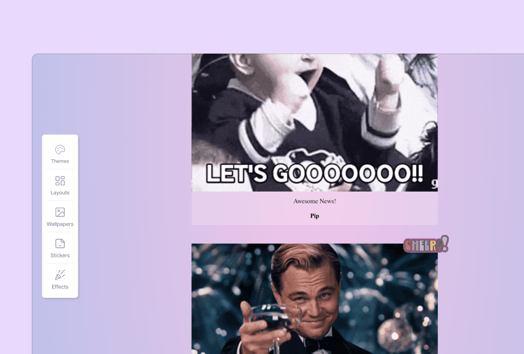 Pick an anniversary theme, write a short opening message, drop in a GIF or stickers, and your card is ready. No design skills needed — every card looks great out of the box.